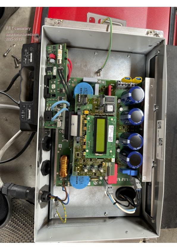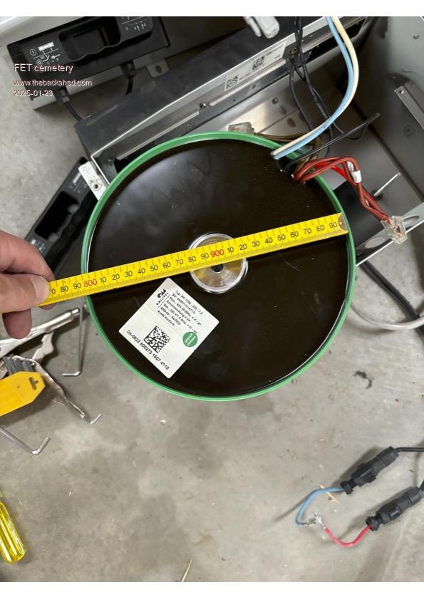 I'm kicking myself a bit for not looking in to this a bit more before the transformer was assembled. Pushing the primary wires aside I can get to about 5cm of the inner winding, counting turns gives 23 on each core over this length, identical. Stacked on top of each other before assembly they looked identical to the extent that I didn't even consider that they may be wound differently. Would one batch of core material being way better than needed and another just good enough account for what I'm seeing? Wiseguy - fully understand your position re IP. I'm amazed at and grateful for the time and expertise that has been volunteered for this project, thank you all! Don't know much about open source but if your work was blatantly stolen wouldn't you still have to lawyer up to do anything about it? Hardly a fitting reward for your effort. KeepIS - Thanks for the link. One of he units was Conergy branded but all had identical labels / specs on the side of the case.The only difference I noted was that the big caps were different brands and slightly different values in one of the red sunnyboy units. All the transformers had identical labels, primary 93V 50/60Hz secondary 230V 7A. Wire diameter is about 2.1mm, 2.15mm with the enamel on, giving a bit more than 6mm sq total cross section of the 2 windings if my maths is right. My gut feeling is that this monster is capable of 7 or 8kW continuous with forced ventilation. It will do 4.3kW all day at 35 degrees C ambient temperature with a fan running half speed drawing air up the middle. No stone unturned, no FET unburned. |