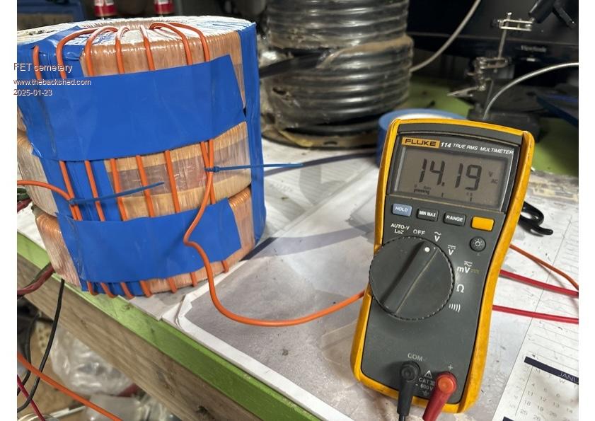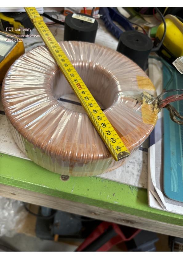 Well I eventually got the three out, wired them together, wound a 7 turn test coil and fed 240V into the assembly - through an old 60W incandescent globe at first just in case. You can see the reel of 64mm cable in the background which is what the primary is now wound with. Fed it through an ac power meter, showed it drawing 19W unloaded which I guess is the baseline magnetising power. Impressive for 30+ kilos of core. To be continued, I'm a bit time poor at the moment. No stone unturned, no FET unburned. |