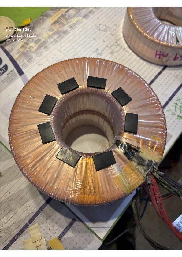 Those are slightly higher power Toriod windings compared to mine, I have thicker single layer windings of 118 turns on each Toroid, when stacked and wired in series, I have 14 turns of 2AWG cable rated at 188A continuous through each 3 stack toroid, there are two of these 3 stack toroids in the inverter. I can confirm that when running at just under 9kW (4.5kW each toroid stack) the toriods hold around 38°C with silent slightly enhanced convection airflow, the Fans switch to full airflow when either toriod reaches 40°C, they have only come on a few times but don't run for long, they quickly cool to 36°C, the 2 Toroids and 4 chokes have never felt more than "slightly" warm to touch. BTW the fans on full are almost inaudible. Everything else is always around room temperature. It's a beast . NANO:Inverter V 8.2ks - Linux AvrDude GUI script V4.1 |