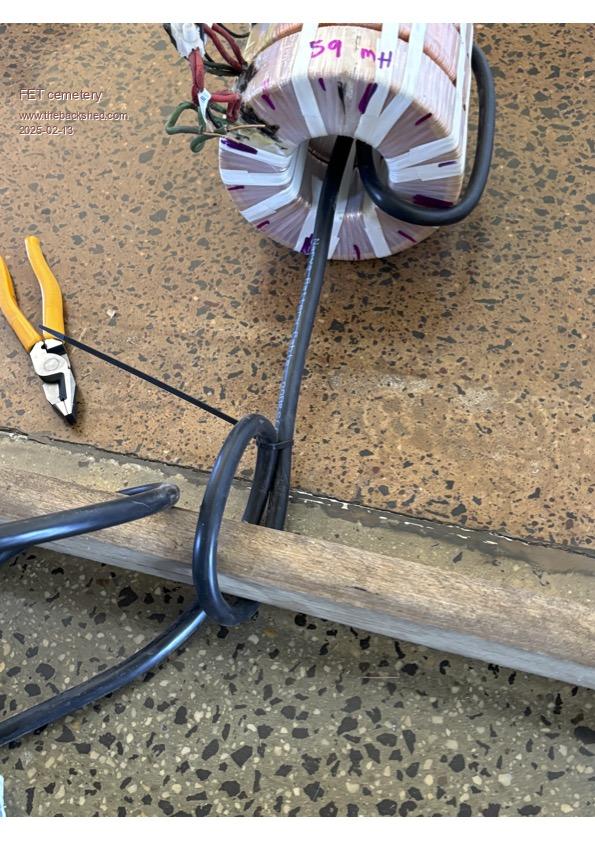On with the show, time flies! I found some adhesive backed neoprene from a long-forgotten project, cut it into rectangles and used it to keep a bit of a gap between the windings on the adjacent cores. The only thing I actually purchased new was some high temperature thermosetting fibreglass electrical tape to hold the assembly together. The primary is 12 turns of 00gauge 64mm cable rated at 370A. Bought a 30m roll of it at a clearing sale for $80, 15 years ago. Probably nearly that much per metre now. Winding it was fun, took two of us. Rolled out 8m of cable, tied one end to a piece of timber placed across a door jamb and basically used brute force to get the windings as tight as possible. No stone unturned, no FET unburned. |