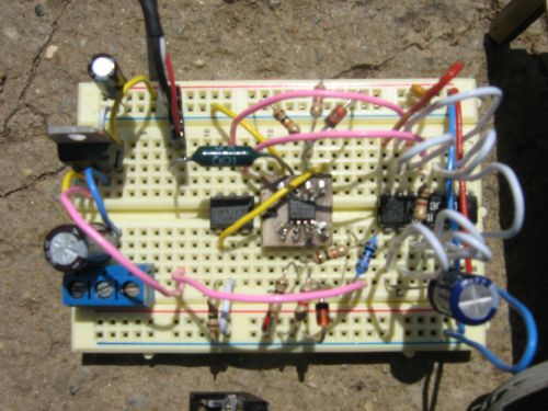 Vasi Surprised it works. Why not use a 74LS132 schmitt input NAND gate? That way the threshold voltages will actually cause the gate to switch and not amplify. Also using the gate output current limiting to drive the LEDS is a silly way of saving a resistor. I hope the 220uF cap isn't a tantalum? They seriously object to being reverse biassed, not at all pleasant when they blow up. And whilst I am moaning, can't we get away from having cicuits with signals joining at a cross. If they all join at a TEE then there is never any doubt as to wether there is a connection or not. Bob ps why not a 555? |