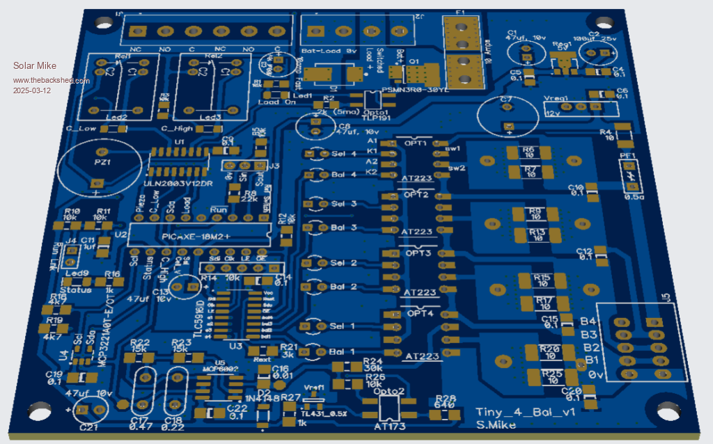 Update: I have this board working, testing it on some worn out 15 year 50 AH Lifepo4 cells, some slightly bloated, and down to 40% capacity, so they are all over the place; however they make great 12v batteries for powering field electronics from small PV panels.