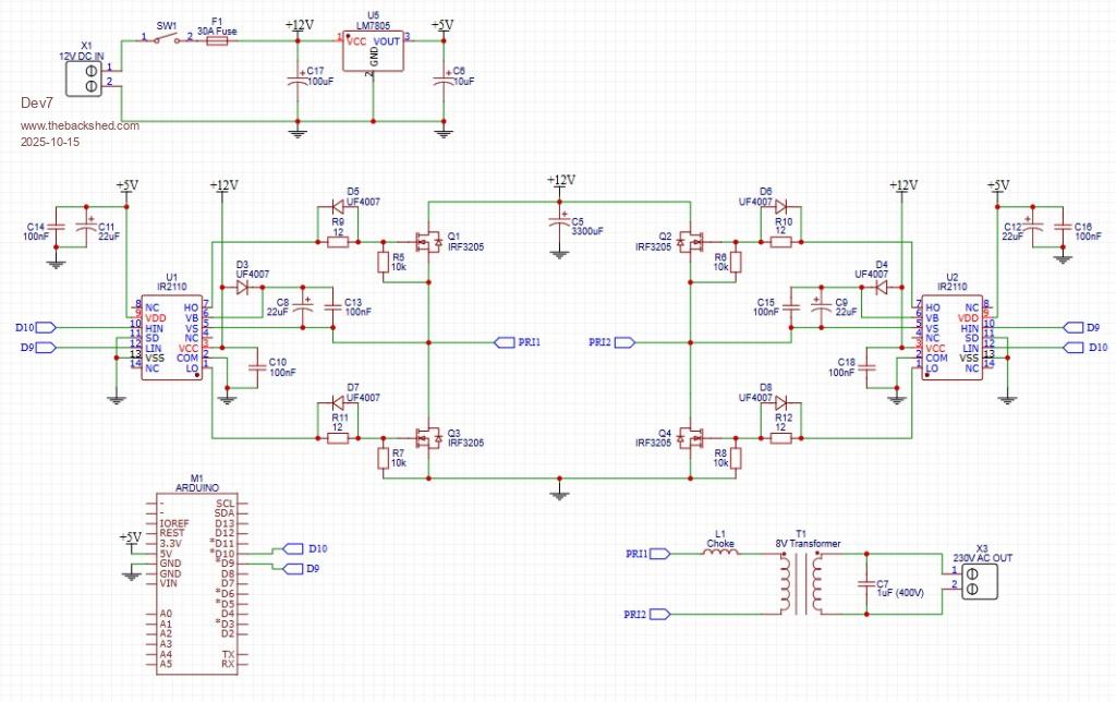 Thanks for the replies guys. I am hoping the leakage is enough to act as a filter on its own, but will be testing. How does leakage inductance change in relationship to power? Is it just the fact that bigger more powerful transformers tend to have lower leakage and hence require a suitable choke? KeepIS, this is very helpful info, thanks. This gives me a better idea of the component values I should be looking for. Plan is to test with a 1uF, 2.2uF and 3.3uF to see which yields best results (without a choke). As for the choke, I have ordered a singular toroidal core to experiment with (picture attached). I am hoping it is of suitable size and has the correct properties so that I can wind my own. Tinyt, I forgot to add that part into the schematic. My idea was to use a ZMPT101B AC voltage sensor module directly connected to the 230V AC output and feed that into the ADC of the Arduino Nano. Then, regulate using the modulation index in code. I have not seen anybody use this module before so I will have to experiment and see if it works. Is there a better/easier way to regulate the output voltage? One more question. I am using bipolar SPWM instead of the typical unipolar SPWM that is used on the EG8010 chips. Besides higher switching losses, is there a major downside to using bipolar SPWM? Thanks. ![]() Edited 2025-10-17 17:02 by Dev7 |
