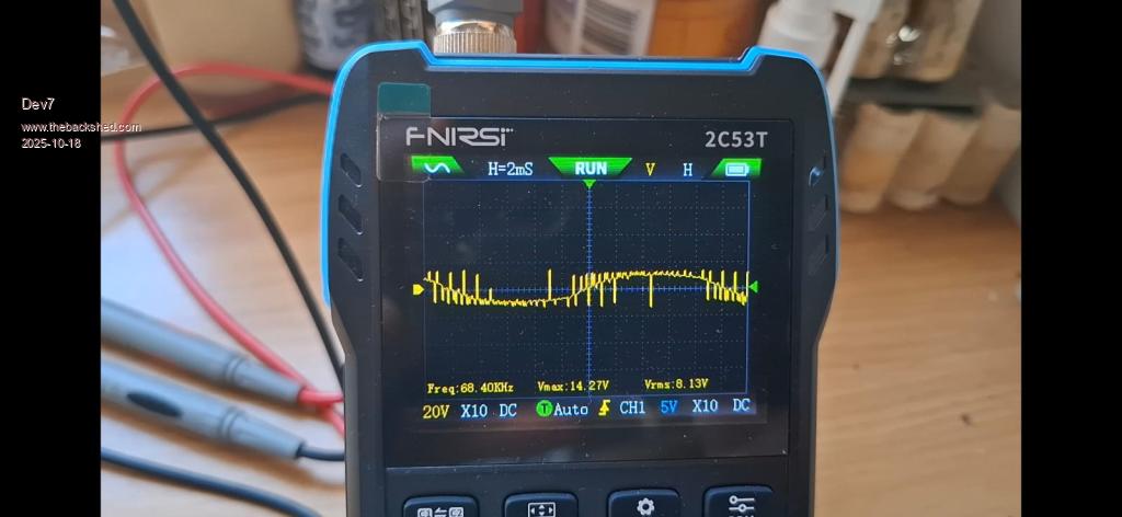 The MOSFET H-bridge is applying a modulated PWM signal to the primary. The scope is doing its best to show that but there are too many PWM cycles per 50Hz cycle to display properly. The 68kHz can be ignored, the modulation is confusing the scope. Add a low pass filter between the primary and the scope and you will see a sine wave. Try 10kΩ in series and 100nF across the scope. If you get 7 to 8 Vrms on the primary with a 100W load the the H-bridge is doing it's job and the low secondary voltage could be due to the type of steel used for the laminations and/or the thickness of the laminations. At high frequency the laminations need to be very thin to minimize eddy current losses. For RF powdered silicon steel is used to keep losses down. If that is the problem, keep the PWM frequency out of the transformer by adding a suitable series choke and capacitor across the primary instead of the secondary may be needed. The capacitor may need to be quite big, perhaps 100µF or more. Some experimentation will be needed with that and the number of turns on the choke. A bi-polar electrolytic would keep the size down. If the primary voltage also sags in a similar ratio as the secondary sag (loaded V/unloaded V) then the issue is with the voltage feedback not compensating for the load. . Edited 2025-10-19 06:32 by phil99 |