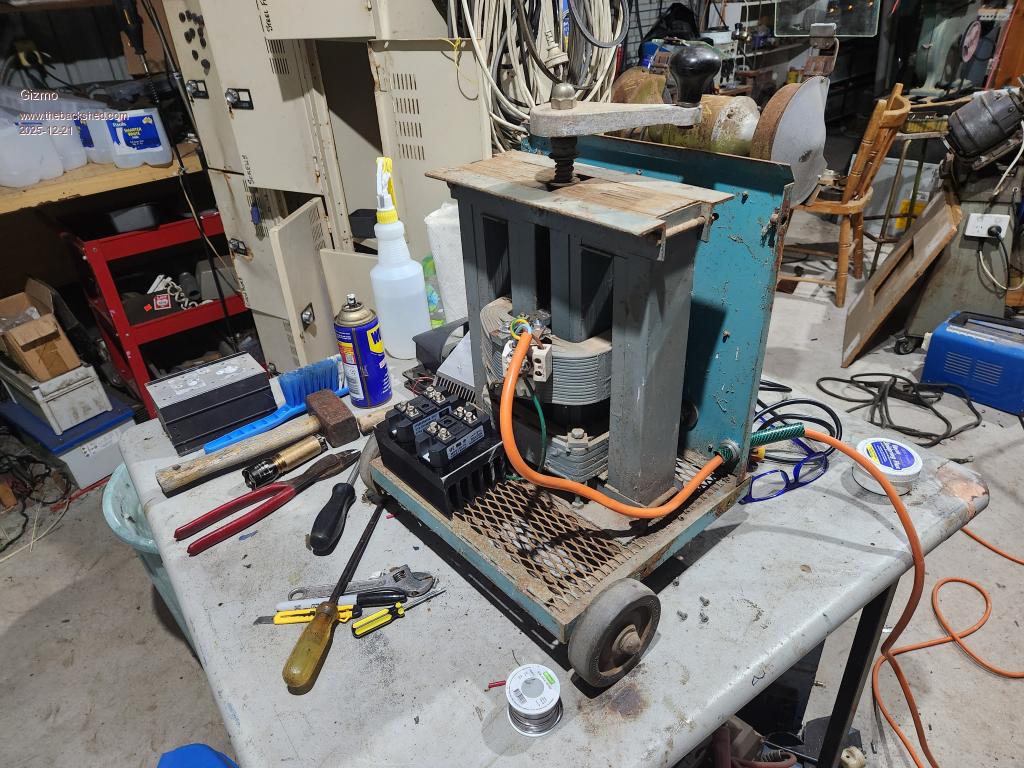 This old welder is a adjusted by a crank at the top, to move the primary coil inside the transformer. It works OK, though draws about 150 watts at idle.