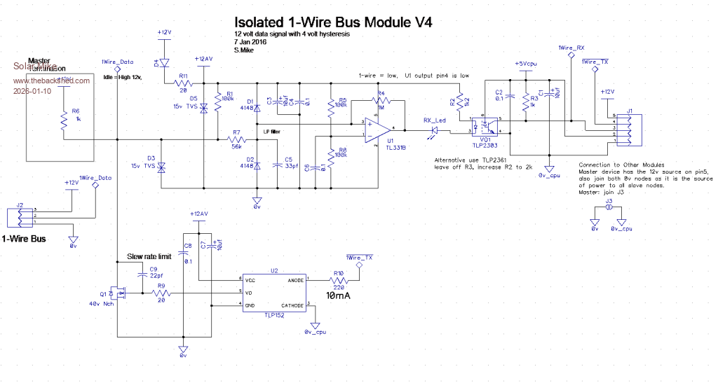 The Master device supplies 12V,0v power to the slaves, with data isolation by opto - couplers. 2 way control bus floats at 12v when not active.