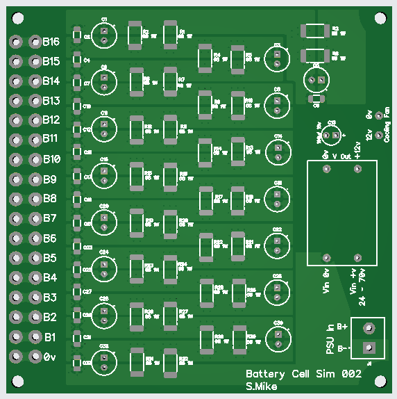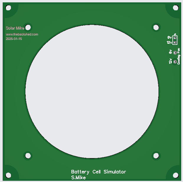 To initially set the balancer up, in the past, I have used a pcb with 16 series W.Wound resistors each with a capacitor, all powered from a current limited PSU. This simulates a 16 cell battery and is easier to manage on the bench rather than connecting to a live battery bank. Was a bit messy, so have decided to use a new board using accurate 0.1% 1 watt resistors and a small cooling fan. The current is just over 100mA and provides a reasonably accurate cell voltage that can be easily varied by the PSU for testing.