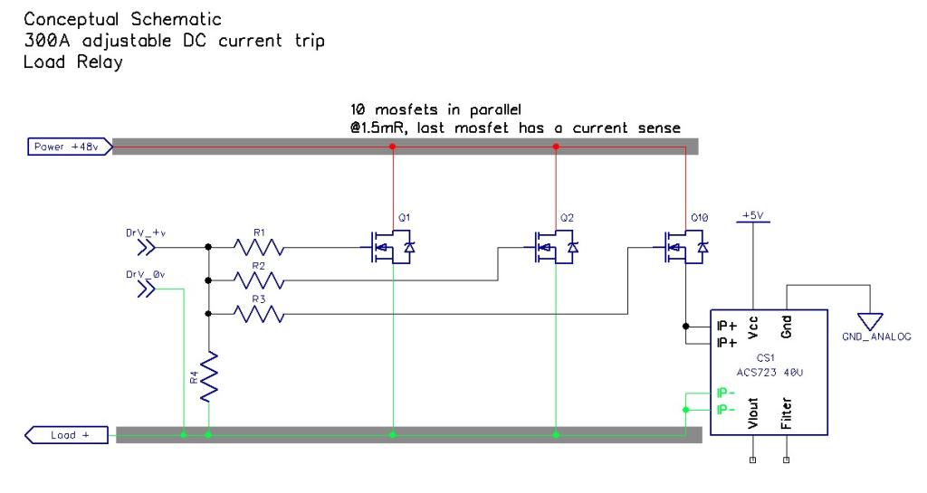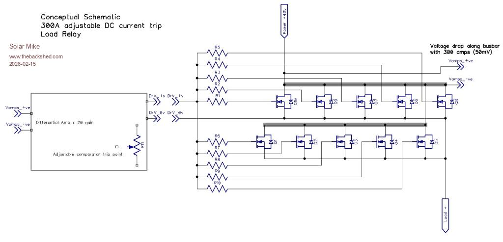 For the 300A SSR relay, have scrapped the idea of measuring the load current across the busbars as the loads are not even along the length due to the mosfet connections. Could measure the voltage drop across all paralleled mosfets, combined 0.15 mR, but this changes with temperature and isn't consistent.