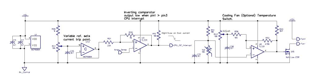 A comparator with setup pot to detect an over current, causing CPU interrupt to turn things off.