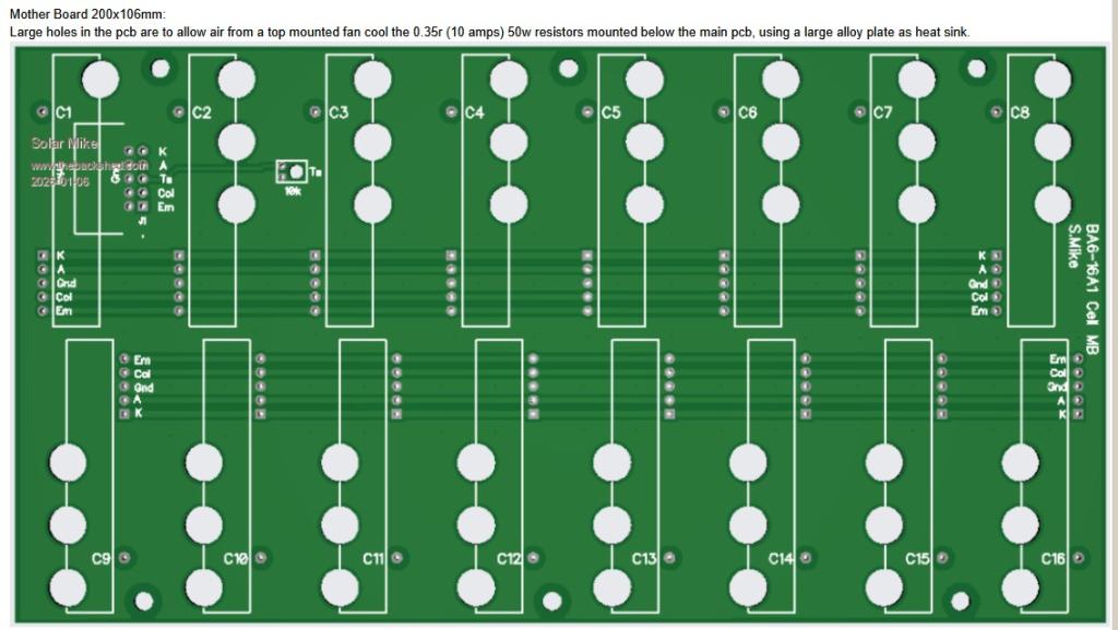 Large holes in the pcb are to allow air from a top mounted fan cool the 0.35r (10 amps) 50w resistors mounted below the main pcb, using a large alloy plate as heat sink.