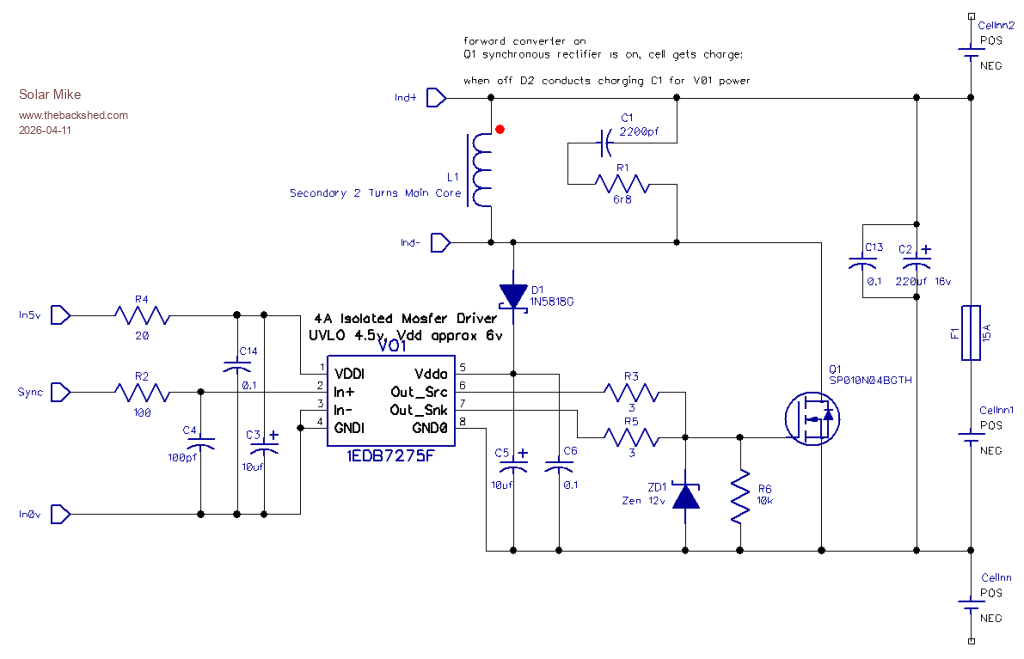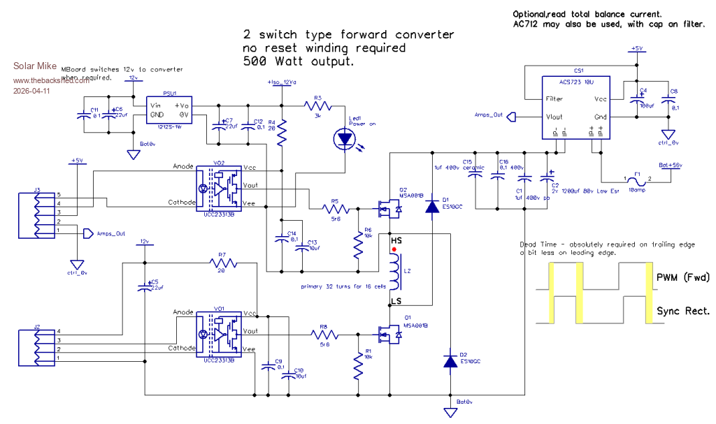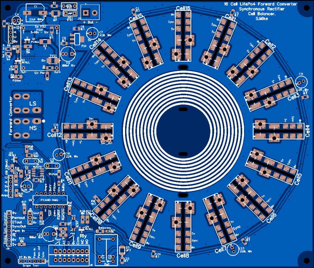 So have flipped the design around and gone for a central two switch forward converter powered by the bank voltage 56 volts at balance point, with each cell coupled to the core using a synchronous rectifier. This is similar concept to the design that Warpspeed produced awhile ago.