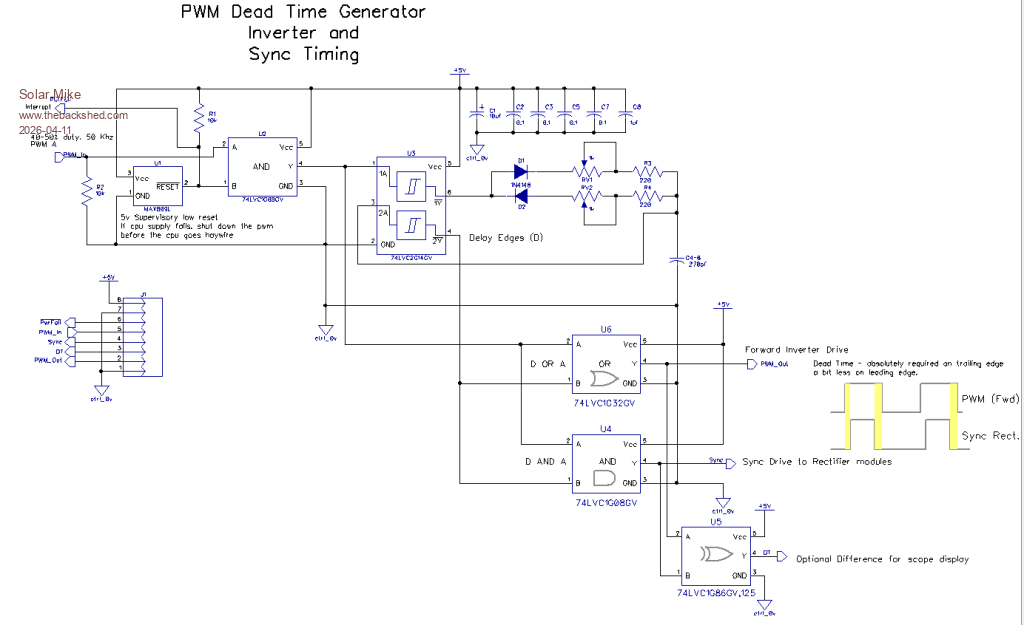 Dead-time generator is just a delay with adjustable times on leading and trailing edges of the PWM, prob be around the 100-200 nSec, will setup using a scope.