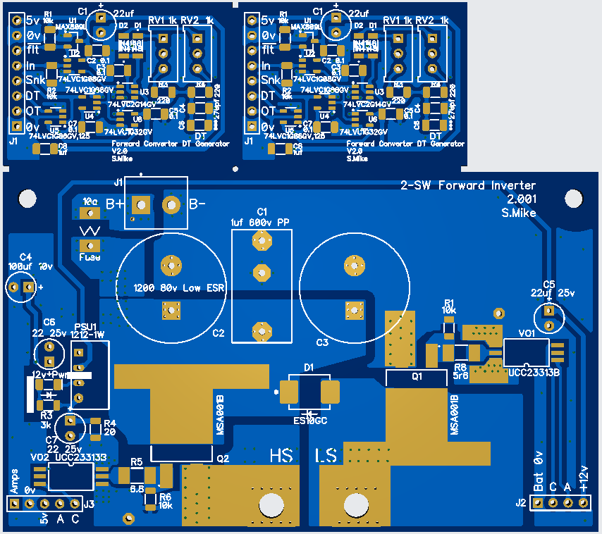 Both forward converter and DT generator are on same 100 x 89mm pcb, cut with large tin snips.