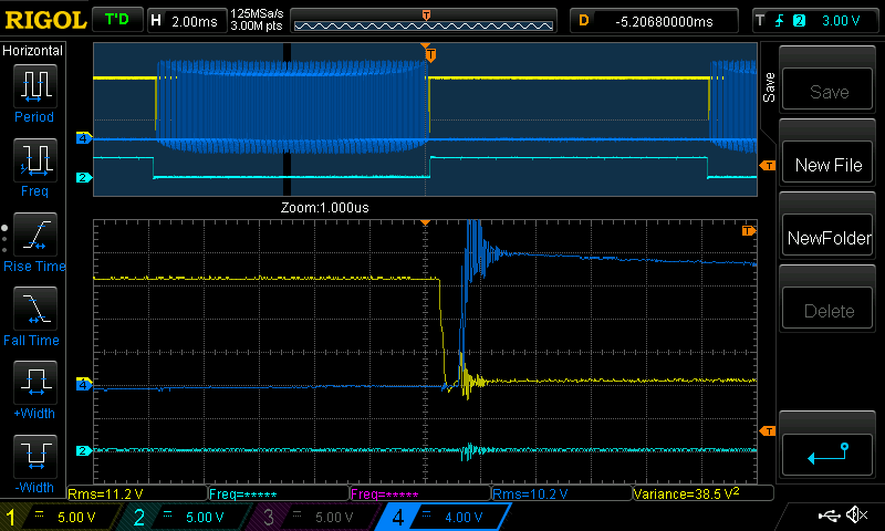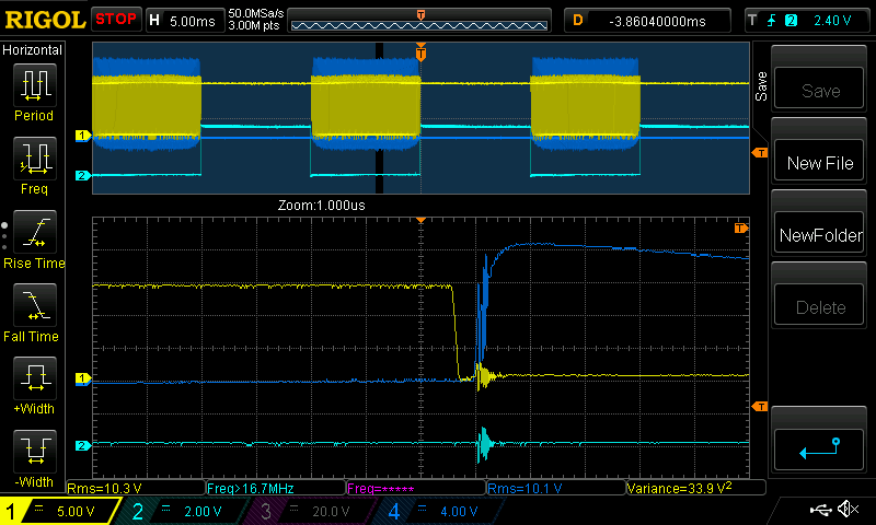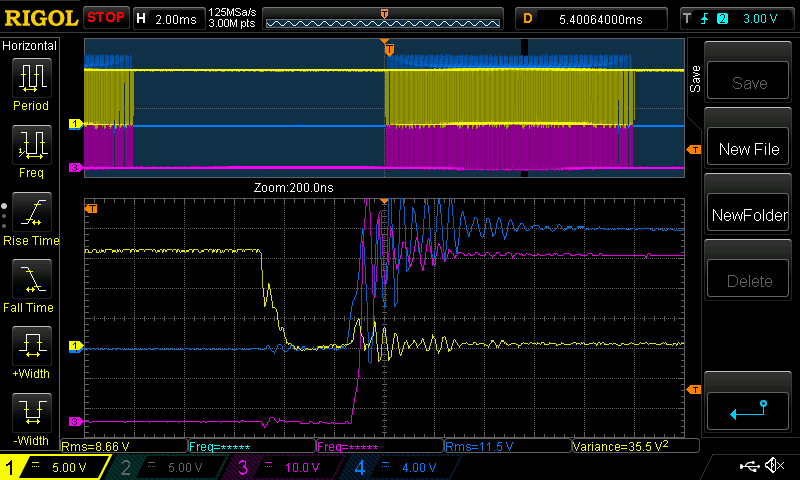certainly we can see much faster switch on and off but there is now a lot of Mhz or more ringing. This is seen in the Dark Blue trace when it goes from low voltage to about 15V, pulling the inverter output up to 54V.