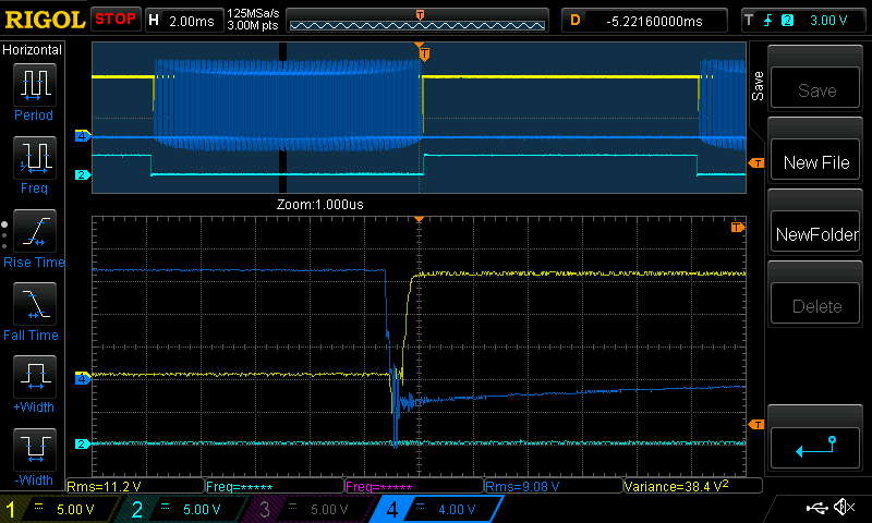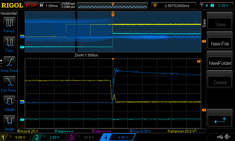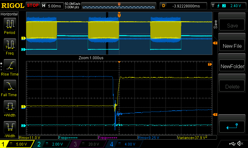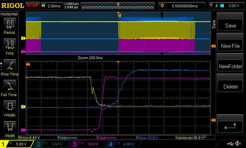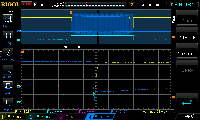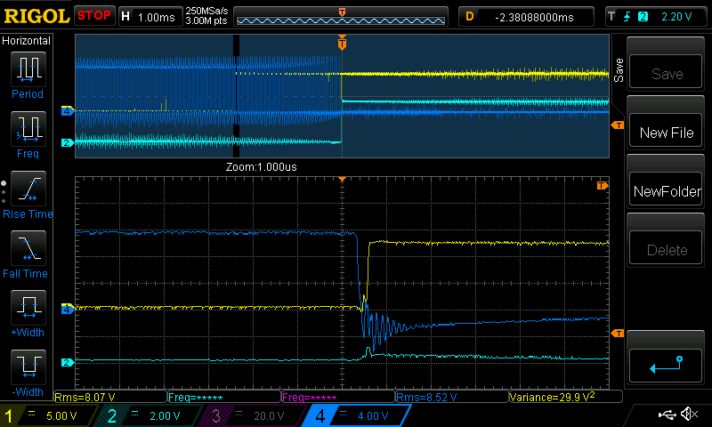 here is a detailed look at high side switch on, this time with 2 470pF parallel across gate and source. this is nearly 1nF.