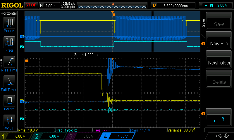 the above tests were at 200W output load. this is with no load at nearly the same place in the 50Hz cycle.
