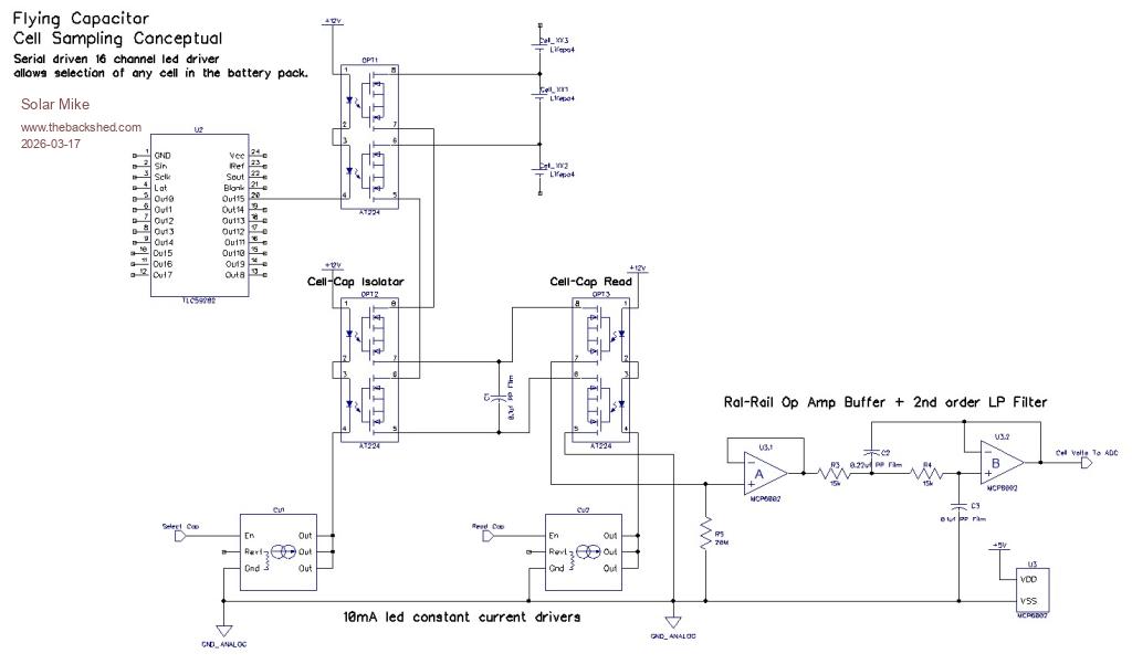 Each group of 16 cells uses a TL59282 serial input constant current shift register LED driver, each output allows selection of any cell using the AT224 opti-mos switch, a cell is selected, capacitor charged, isolated, them measured by the CPU. The timing has to be correct, to allow the switches to fully open\close and the capacitor charge to 100%. A mosfet discharges the capacitor after each measurement (not shown here), and the cycle repeats.