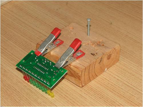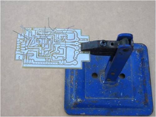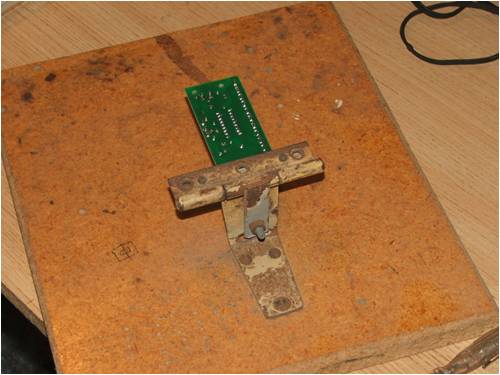 Board assembly As you will all know, one of the awkward things about assembling a board is holding the little bugger while inserting components and soldering. The little helping hands gator clips thingies are more than useless in my experience. There had to be a better way! I fabricated a pivoting clamp that can flip over one way to insert the components and flip back the other way to solder thing in place. It was another project that was well worth the effort and has given many years of service. Have since made several for others and now include a edge around the base to form a tray, as when you unsolder a component for an alteration all those used little bits end up in the tray and ready to be reused again. (or at least found)