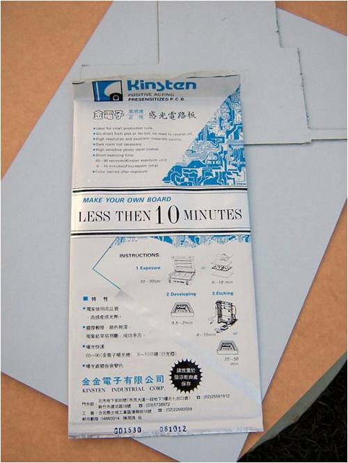Then computers, printers and the internet with free software downloads come along. This had ability to do all the artwork and print out a copy. Even a computer illiterate person like me could do this? Great! But what I inspired to archive was to reproduce what I seen on the computer screen onto the PCB with repeatable consistent results. This has taken me to the method I have adapted to work for myself and hopefully others find it helpful to their PCB fabrication. Positive resist pre-coated board is what’s used, and it gives good results for a not over expensive cost and is not difficult to work with. One supplier is HERE I have never dealt with them, but the prices are about right and the product is a consistent quality. (Kinsten) There is a lot of boards in a sheet 300x450mm and works out cheap per board. I have only used this brand once or twice and it worked well. This sheet of double sided board is opened but not used. ( too hard ds.board) The sheets of board in the background is what I use.