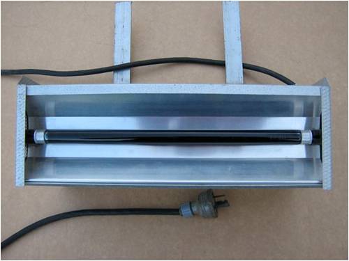 The process uses Uv light to expose the positive resist film on the board. The areas that receive exposure to Uv light will develop away and the area without Uv light exposure will remain to protect the copper during etching. The developing solution is 5 grams of caustic soda in 1 litre of water, or about a teaspoon full in 1 litre of water. Don’t try to mix any less amount, as the ratio is to hard to measure, and you may well completely strip the board if mixed to strongly. I recommend you do a test strip when you mix a new batch of developer to check the strength. (see test strip at the bottom) Basic procedure. Design artwork on a computer and print it out. Place the board on a flat surface that is rigid enough to be able to be moved ( I used a clip board for years) Align the artwork to pcb and place a glass sheet on top Expose to Uv light for the determined time period (depending on Uv light source used.) Develop board in the caustic solution till no green residue remains between the tracks, pads, etc. (over developing will give a poor result with etching) Rinse off the caustic residue in water Etch the board as per normal. Easy Ha! Sunlight exposure will also work and some fluros to at close proximity will work to some degree (if you can wait an half hour or more) I used an old bug zapper uv fluro I had found in council road kill rubbish for a long time (15-20 min exposure)