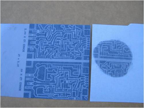 Since trying UV leds have not used the zapper fluro again. Now the step by step. Prepare your circuit artwork on the computer and print it off onto plain white paper in a high quality setting for the printer. Print in black ink. The image needs to be printed in a mirror image to what the copper view will end up to be. (back to front) Most pcb design artwork packages will print the bottom side of a board (as used for single sided boards) in a mirror image as standard. The reason for this is we need to place the ink side down onto the pcb for exposure. With the black ink in contact with the uv sensitive film no light can reach that part of the uv coating and will not be exposed. Cut the image from the paper sheet and sparingly apply a light coat of cooking oil (vegetable oil) over the Back side of the printed paper with a tissue. Rub it gently to get the oil to work into the paper. You will see the printed image appear quite clearly through the paper. Clean off any excess oil with a clean tissue. ( It pays to discard the paper after use and print a new one if several days has pass after oiling it)