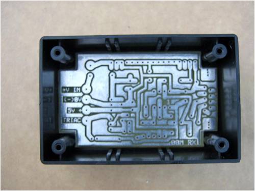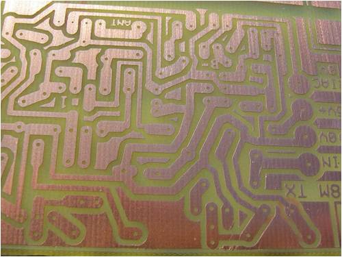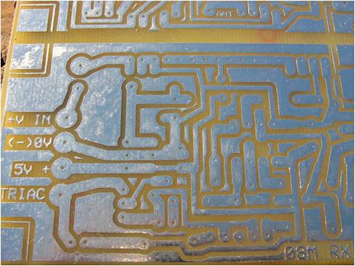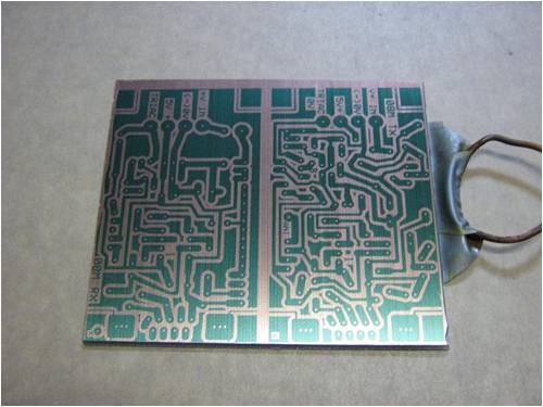 Place the pcb in the caustic solution and gently keep it moving in the solution. The image will start to appear this may be quick or slow depending on the strength and the temperature of the caustic solution. You will need to ensure all the green coating between the tracks has developed away as a light hard to see film remaining will make for a poor etch. I find that a fine line along the edge on the artwork can give a good indication when over developing is happening, as this line will tend to be noticed to disappear first. Rinse the board and inspect a few times during developing and you will soon see when it has developed fully. After developing the board should look something like this.