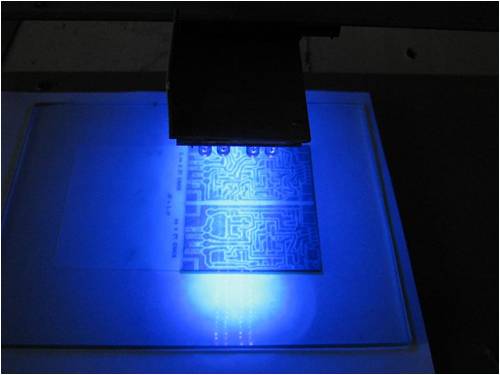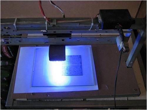 Align the printed artwork over the board ink side down Place a sheet of glass over the top of the paper to hold it firmly in contact with the pcb. Check that all is still aligned correctly, Start the uv light exposure. I find 10 passes (5 ups and backs) of the uv leds travelling at 300mm/min (slow) at a height of 100mm from the circuit board gives a good print. If the leds are used stationary than exposure time is 10 times less, as the leds only cover a strip as they travel up and back along the board. My uv light scanner was made from the carriage section gutted from an old inkjet printer and Uv led clusters. ( 2 rows of single leds work just as well)