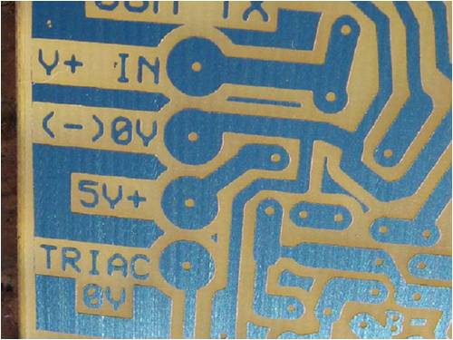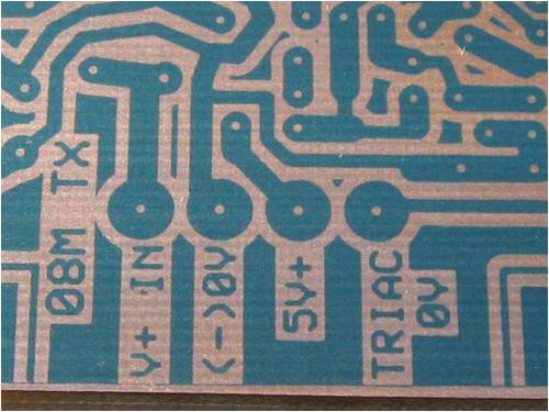 Check the board for any defects and correct them. If you have a bridge between tracks then put a scratch in the green coating, as it will then etch there. If you need to repair a track, I find a CD marker pen works well. Next etch the board and afterwards it should look like this
