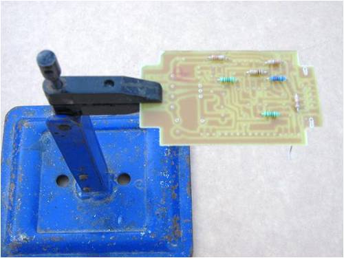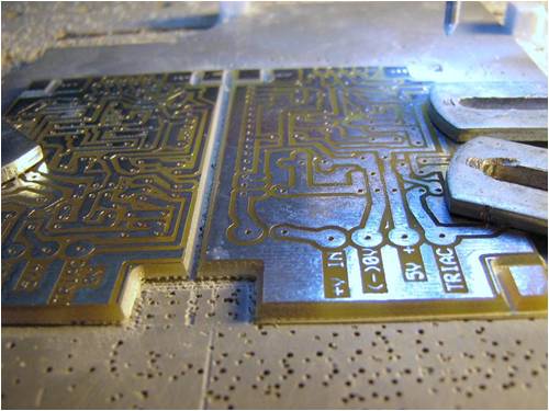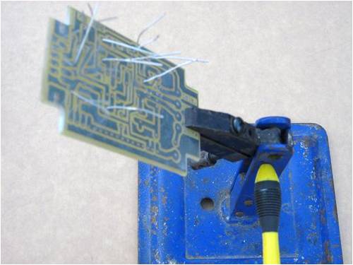 Excellent write-up, excellent pictures. You've obviously put quite a bit of time into it. Deserves a place on the front page, in my not so humble opinion. Have made many etched PC boards in the past (using a spray to make the boards photosensitive, 'Positiv 20'). After initial problems, testing, changing procedures, etc., this method of making boards worked reasonably well for me. It's just something that I utterly, deeply and totally hated doing. And the drilling (even using a proper drill press) that followed it was enough to really spoil my day. The downside to those etched PCBs I find to be the inflexibility to modifications or using slightly different components (different mechanical size) than the designer intended. As basically everything I build is a prototype, I've grown very fond over the years of perf board (not the kind with the strips, but with small copper pads). It's very flexible to use, easy to change things, and, best of all, you can build *extremely* compact circuits using it. I also find that adding SMD resistors or capacitors works fine. Here's one of the latest projects (also very much in progress), a sinker EDM machine: http://picasaweb.google.com/motorconversion/SinkerEDM#539472 7798897988226 Point-to-point wiring takes a bit more time when doing the actual wiring/soldering, but when taking into account the amount of time it takes to make a PCB, I think you'd only be ahead timewise for very complicated projects. Or actual production runs. In my early electronics days I used nothing but etched boards, but nowadays I use nothing but perf board anymore. Though, for RF purposes, I'd still go back to etched PCBs; haven't done much RF in the past few years, so not an issue for me at the moment. The few times I did it was much easier to cut striplines with a knife (in Teflon print). I tried the photocopy method too (heat transfer the toner to the PCB), but never quite got it to work for anything but the very simplest boards. Even though I tried different printers, toners and paper. Admittedly, perf board takes a bit more time building, but using proper procedures, the boards are at least as reliable as etched PCBs. Future modifications are much easier though. And considering the time it takes etching and drilling PCBs, I doubt there's much time benefit for one-off products. Unless you have a CNC router and drilling machine. Incidentally, one of the ideas behind my CNC router (WIP) is to use it for milling PCBs and drilling the holes. I very much like the idea on how to tin PCBs - it never occurred to me to do this your way, seems like an excellent solution. (I do routinely use the heatgun for depopulating boards). And I do agree with the handiness of board clamps - I'm using a Panavise and love it very much. Only regret is not getting one 15 years sooner. Have you considered modifying an old flatbed scanner with an UV light source? Seems like an easy solution, with all the mechanical bits already present; just tap in to the board that drives the stepper motor and add your own pulses/signals to control the motor. In the past I used HNO3 (saltpetre acid) to etch boards. Worked pretty well for me. Fast and cheap acid. Noxious fumes though, must do the etching outside as the NOx really hits your lungs. Of course, one should also etch outside using FeCl, as the vapours are corrosive. NaOH (natrium hydroxide) used to be available in powder form over here. Dosage was pretty important, as a too strong solution indeed removed *all* photoresist from the board, instead of just developing the exposed bits. Also, do not use a finger for stirring the fluid. It never hurt, but the next day my finger nails would turn brown and skin started peeling off the stir-finger... +1 on the carbide drills. Just don't use them when drilling by hand, they're guaranteed to break. Very hard and durable drills when drilling glass (FR4 board), but also very brittle. Good tools make a job so much more pleasurable. Which probably explains why I spend more time building tools than using them....