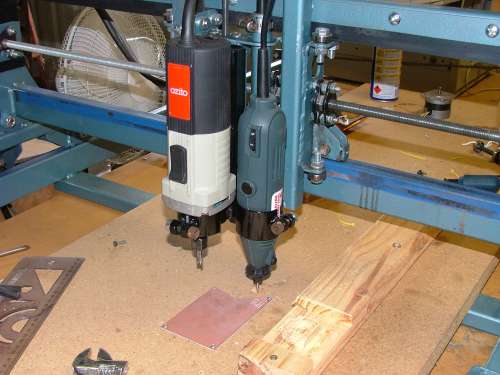 Good ideas Trev. They are simple but practical which is what many are looking for. As for mine being a masterpiece? not sure if i would put it that way. It works. The cnc router is the second one i have built or i should say the first one mach2 as i had rebuilt the Y axis and Z axis on this one, hence the multi layer tubing frame. I had the intension to rebuild the X axis (table) as well but not yet got to this, so Y & Z were adapted to the old frame on the X axis. As the previous Y, Z was kicking about on the floor i built another X axis and reworked the bits off the previous Y,Z to make a complete cnc router for a good friend of mine, so he too can drill boards with ease. There is a mass amount of work in making one and you wont get much change out of $500.00 by the time you buy the few bits and pieces you need. I looked at buying a bought one and prices started at around $5000.00 and jumpped to $50,000.00 real quick. I could not justafie the cost for my needs so thought i would have a go at making one. It felt like a never ending project but i got there. The first run around with a broken drill bit and a paper print out of a circuit, that i could press indents into the paper and not punch through it in all the pads gave me a smile bigger than the grand canyon. I looked at building the motor driver board, but by the time i added up all the driver chips and other components it was about the same price as a complete 4 axis board out of China for $100.00 so i took that option. I use Mach3 as the cnc software and only have the free demo version. This will only allow me to go to 500 lines of code which is very limiting to the work you can do, as a circle cut could be 2000 lines on its own. There is always a way to cheat this but a pain in the butt just the same. I will try to find some time on the weekend to take some photos and put a short discription together. It is far from a work of art as i made use of what scrap (better said without the S )i could find to do the job. I do intend to build another one with all the good bits in it, so i can machine down to 0.01mm as at present i can get around 0.1mm accuracy or better. Trev i can hear your cogs of thought clunking away in the background.