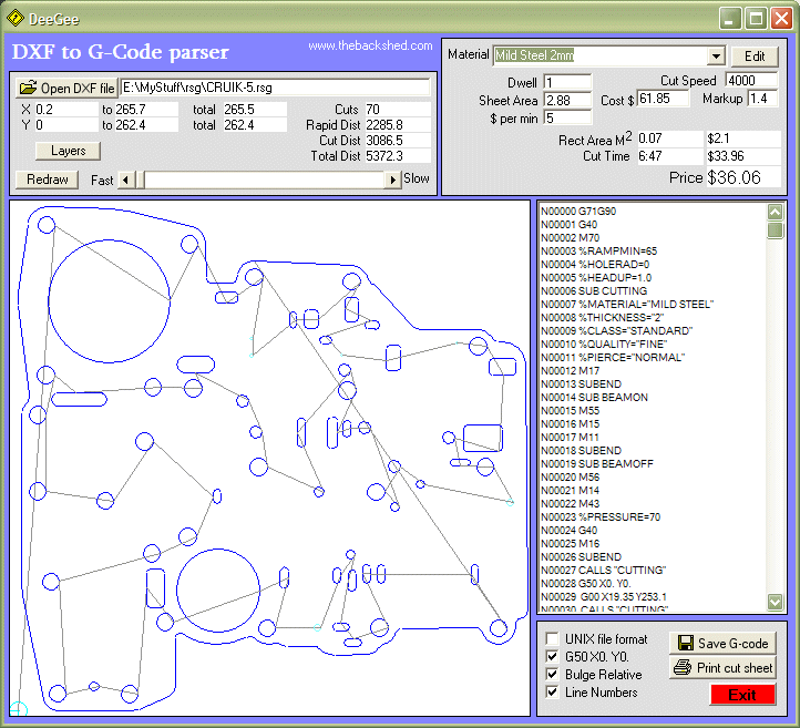 Actually, I have a windows based one I wrote a couple of years ago when I was working at a laser cutting business. It takes a DXF file and creates the G-code to suit. It has a library of materials, speed and costs, and gave a pretty close cost of the job, usefull for quoting. I also used it on my cnc router. I plan to put it on my cnc site when I get the time. Below is a screen shot. It would be good to get these utilities in one place. Glenn