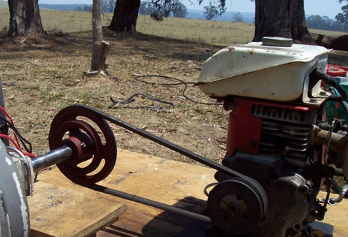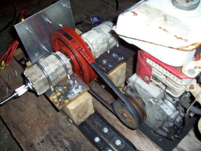 May possibly also help to have a bigger pulley on the motor than on the generator, thus gearing it up. This will avoid over revving the engine and possibly save fuel.