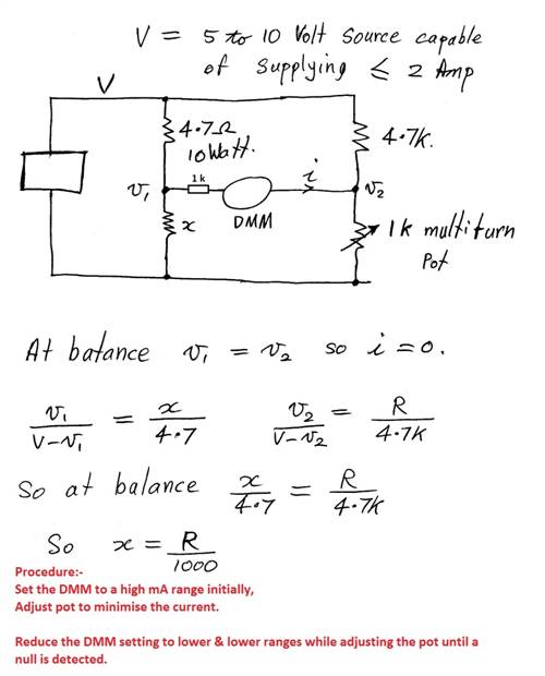 You are quite right about higher currents needed to more accurately measure very low resistances. The above circuit uses 100 mA, which is going to hit a normal PP9 battery very hard indeed when the unknown resistor is connected up. Why not build the above circuit, but use a one amp plug pack for power ? Provide three constant current outputs available across different output terminals from three separate current regulators, 1 Amp, 100mA and 10mA. The one amp regulator will definitely need a heat sink. Then you will have 0 to 0.2 Ohms, 0 to 2.0 ohms, and 0 to 20 Ohms. Just plug your clip leads into the right holes, and you are set to go. For reading higher resistances than that, an ordinary multimeter should work fine. Thinking about this a bit more, all you really need is the accurate current source. A multimeter on the dc millivolt range can be used to read resistance instead of the panel meter. And a metal enclosure could work as the heat sink. So just a dc plug pack, and a diecast metal box with some 4mm terminals on top may be all you really need. Cheers, Tony. |