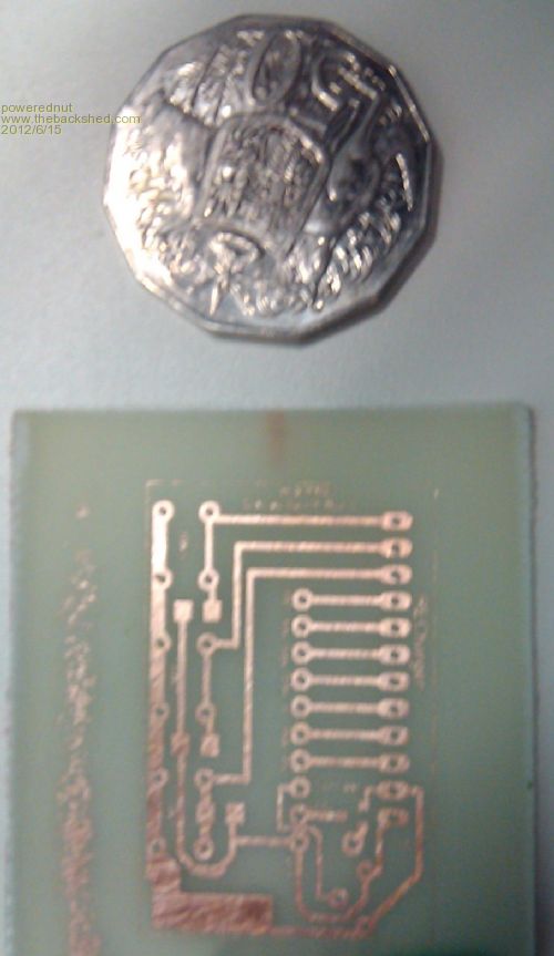 Sorry about the dodgy quality of this image... I've only got my phone here to take it with today. The 50c piece is included for scale... the crappy copper on the left is from when I pulled the board out of the echant early. Its outside of the board perimiter and will be trimmed later. most of the tracks are 0.024", but there are a couple of .012". I havn't tried anything below that - I suspect its the limit of this method. The square pads without holes are for 1206 size SMD resistors. The lettering is readable in most cases and is set at 0.032". The board perimiter is mostly intact, despite how it looks in the photo.