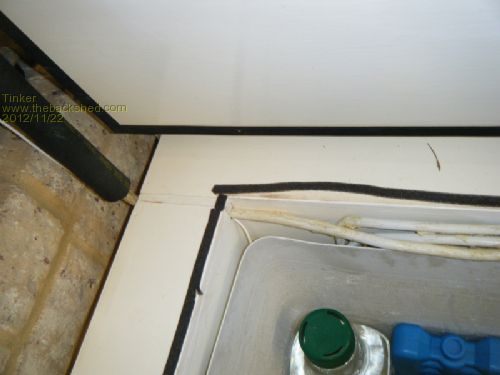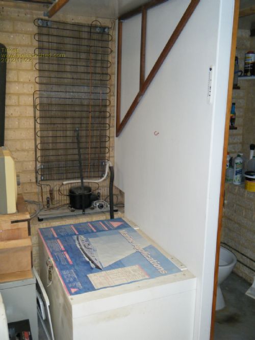 This is a picture of the finished product, not pretty but functional. The box is best built from the inside out. I started with 3mm masonite, the one that has its smooth side coated white. Its cheap but not very stiff so external pine cleats (20 x 20 mm) were used to stiffen it and provide more gluing area. Every surface was painted outside with waterproof primer & waterproof topcoat. Bathroom paint would be fine, I used some left over boat paint. There is a 1mm sheet of white ABS plastic lining the bottom to prevent wear & scratches on the painted masonite. Next I attached sheets of 25mm second hand polystyrene around the sides & bottom, 3 layers in all, making sure the joints were overlapped and any gaps were filled with cartridge foam in sealant. Most glues attack polystyrene so choose one that is safe. When finished this should be still square all round so it easily slides into the outer box that was made next. I used 9mm plywood for that, best to use something that is not too dense & resists heat conduction. This box could be lined with alu sarking as well. But it is important that the outer box is constructed well sealed and also sealed with paint inside & out to make it last. The inside box was then inserted and the top gap sealed with 3mm plywood, painted as above. This surface should be level as it makes the seal with the door. Below is a picture how the cutout for the cooling pipe & thermostat was arranged.