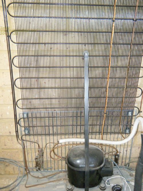 When dismantling the donor fridge great care must be taken to avoid excessive bending of the copper pipes. They and the attached condenser radiator will be very floppy and difficult to move with just two hands. A temporary frame to hold them is useful as the copper tube easily work hardens and becomes progressively harder to bend to the final shape. Worst of all, it could crack and then the greenhouse gas police will be very cross , beside a lot of dismantling time was for nothing so take care.