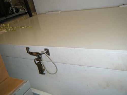 The lid was made similarly than the box, it must have a flat mating surface for the foam & thin rubber door seals. The hinges need to be extended to the top if this chest cooler is to sit against a wall like mine does, see picture below