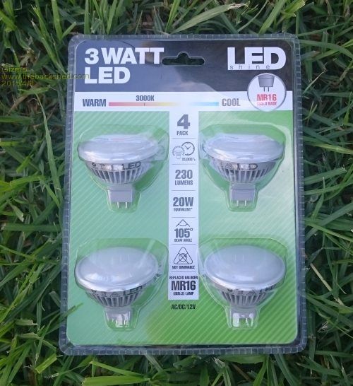 Bunnings hardware have been selling these 4 packs of 12volt 3watt down light LED's cheap for a few weeks now. $10 per pack, so I bought 5 packs. They also have 240v LED downlights ( different connector ) for the same price, so grabbed a couple of those too.