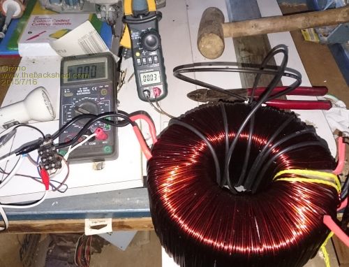I ended up with 25 turns on the first layer, then added a further 7 turns, which made it a bit messy. I connected up the transformer secondary in series with a 60watt bulb and powered it up. The secondary was sitting at 220vac, and the primary had 35v. If I do the math for 230vac, the primary would be 36.5vac. After reading the forum threads on Fieldlines and Energy Matters, I think I should take off 3 turns to get that voltage closer to 33vac. There is a lot of info in the Energy Matter thread about this, but at over 120 pages, it takes many hours to find the useful bits and I'm still only a third of the way through it