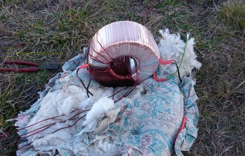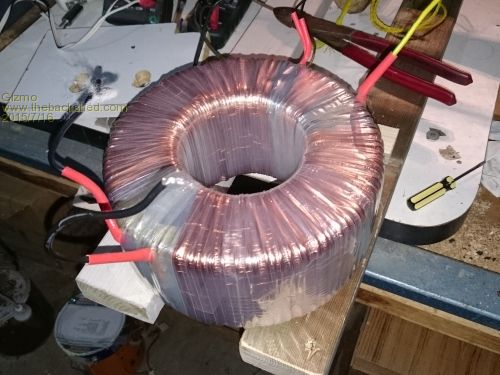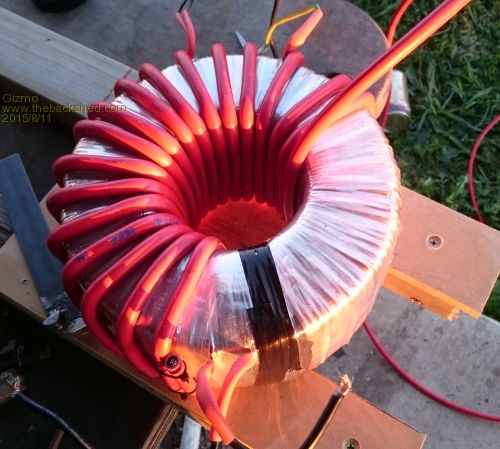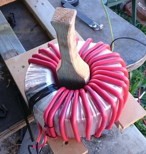 Oztules uses the toroidal transformer from a Inspire 1.5kw grid tie inverter. This is a 130v / 240v transformer, with a single 2mm diameter copper winding on the outside, the 240v, and a 2 in hand 2mm winding on the inside, the 130v. Oztules uses two of these toroidal transformers to build a monster transformer. He removes both windings, glues the cores together, and winds a new secondary 240v winding and a low voltage primary winding.