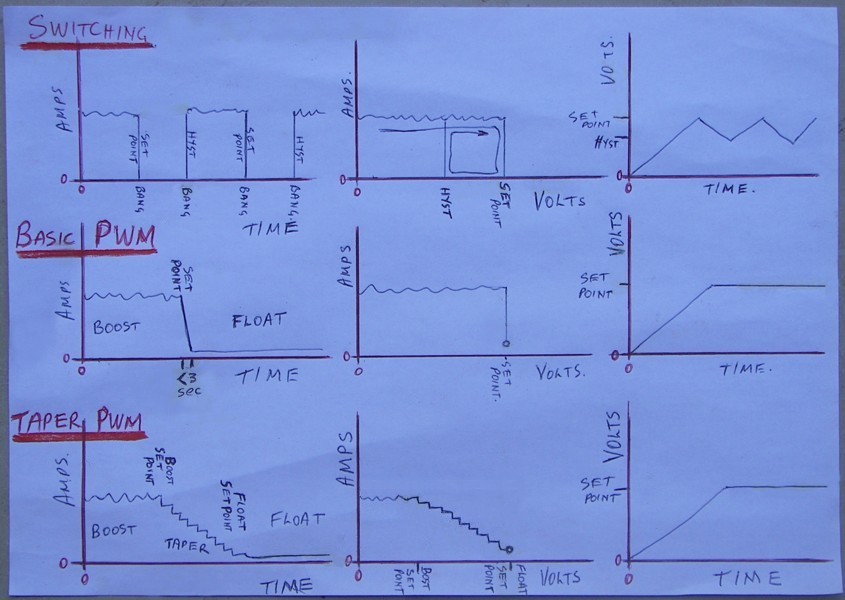 The Taper PWM by stepping method allows full boost current to a 'boost voltage set point', then reduces the charge in 10 voltage steps to a 'float voltage set point', where it then maintains this voltage with a dribble charge as required.