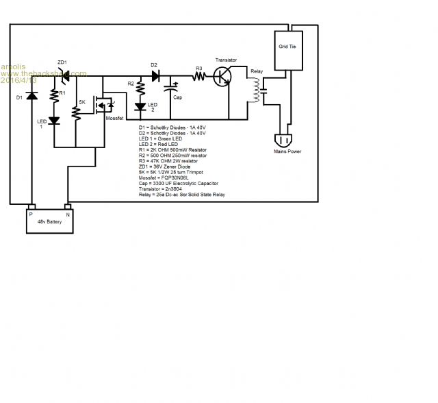 The idea is that the 48V battery bank is reduced down to the proper voltage to activate the mossfet via the Zener and trim pot. LED1 to show in charge mode. Mossfet then opens up 12v circuit to capacitor that holds charge. LED2 shows dump in progress. While mossfet is open the relay connects the positive sides from grid tie power cable so the grid tie starts pulling watts from the battery bank and injecting into the grid. This assuming the grid tie has proper "island protection" so that when it is off it is not drawing watts when the mains power is not connected. When Battery voltage drops and the mossfet shuts down power the capacitor now bleeds energy to the relay until depleted. I understand to get proper timing to the specific battery bank so as to not over discharge the capacitor or R3 values may need to be adjusted but I choose these for just ballpark guesses based on videos watched. Anyone see any issues with the circuit? Am I over complicating things? Am i under complicating things? Any thoughts or criticism will be greatly appreciated. Will it work? Well lick your fingers and touch the two leeds. PZZZZZZZT |