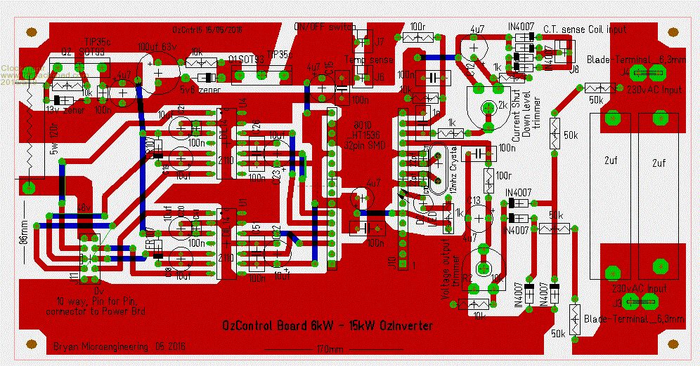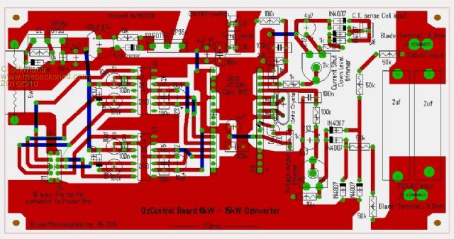 'oztules' put up with me and I finished with a World beater of an 6kW OzInverter. However PJ played silly b.uggers with the 48v to 230vac boards. With some discussion, (actually I think 'oztules' loves a challenge) he headed off down the route of lets make our own Control Board, I did the 6kW-15kW power board, I used the good things from the PJ board, and re designed/modified the bad things.