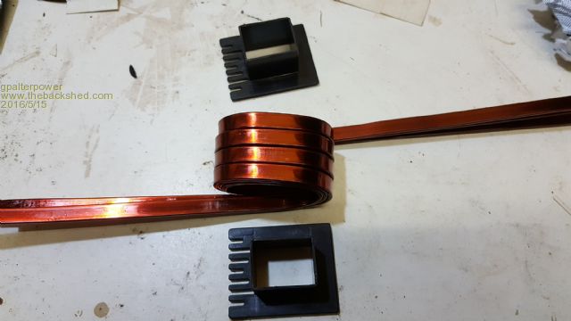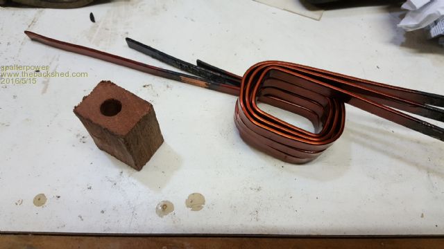 I procured some 8 x 2 mm enameled copper strip and made a former from timber. 3 layers of this will give me 48mm/sq . Needless to say it turned out a bit of a dud as the corners were too tight and didnt quite fit the former!