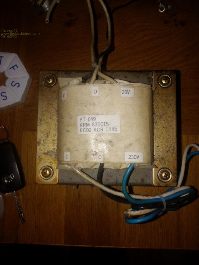 Thx Glenn the fuse was after the 2 rectifiers and is rated 20A Transformer is about 6x6 inches in size. quit heavy too ron |