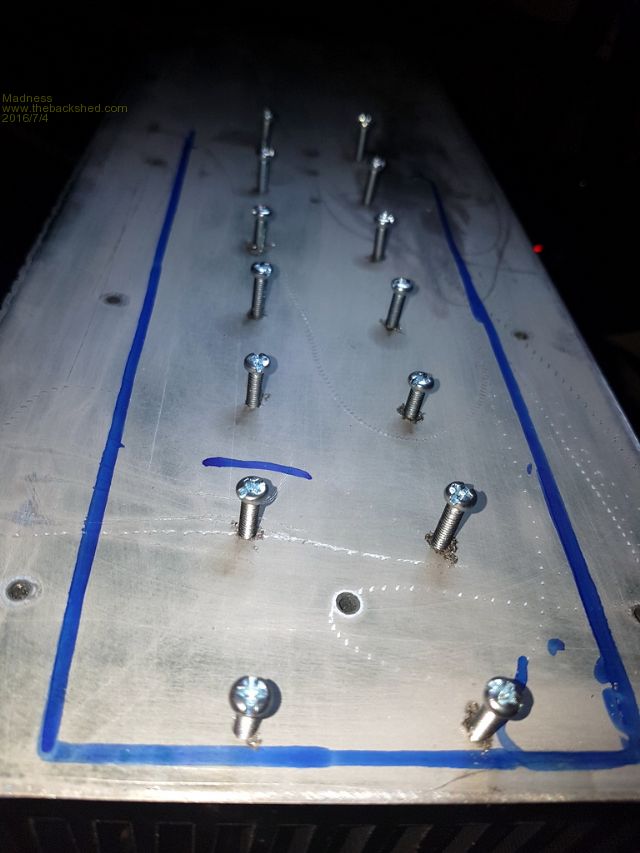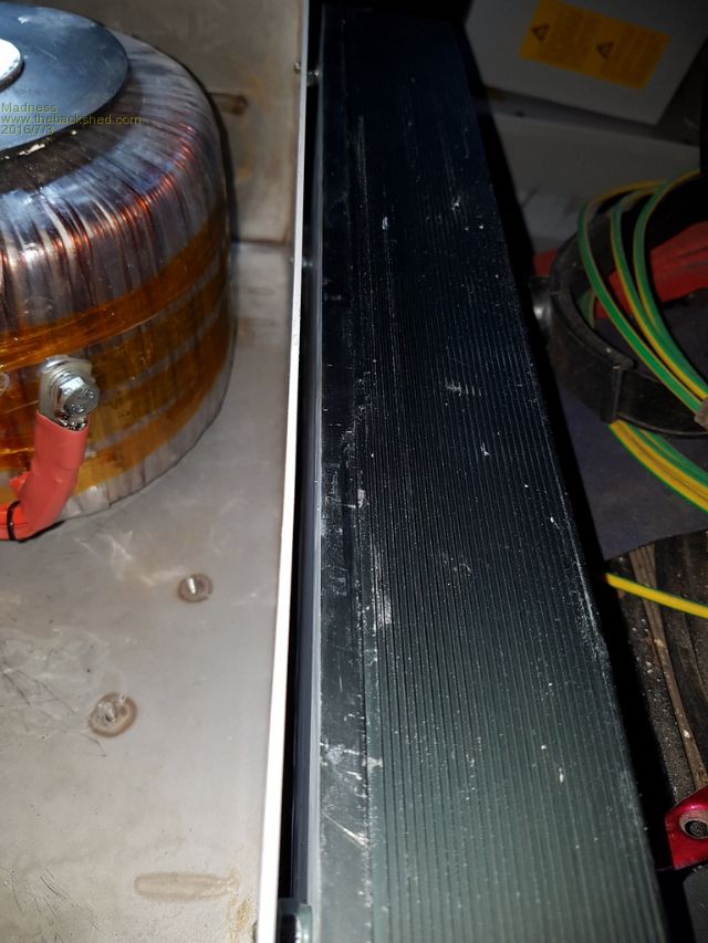 I may need to remove the Torroid bolt so it can move to the left, there is about 20 mm to play with there. I have just stuck the heat sink on there with a few nuts as spacers to see how it all fit together. The idea is to leave a gap for air circulation out the top of the case. Also you can see I have cut the case under the heat sink to allow the PCB to fit and for air flow.Edited by Madness 2016-07-04