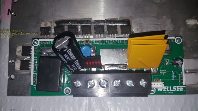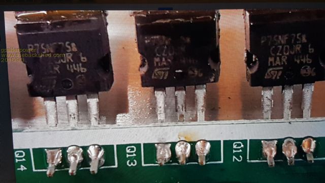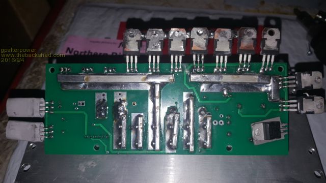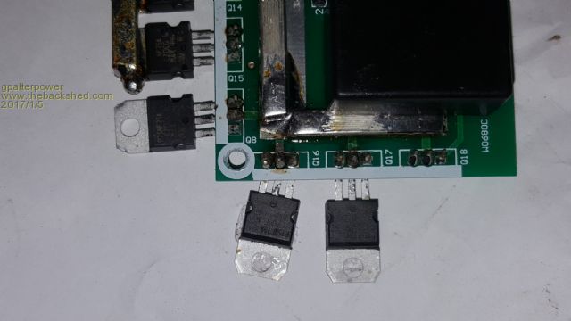 I removed it from its mounting and took off the front cover. Everything looked ok at first glance but thur the magnifying glass showed a different story. The printed circuit board was o/c to Q15,16, & 17 one being really hot. Its no surprise as this 60A controller has been working hard being fed by the 2 arrays. In the winter and spring it wasnt an issue but now the summer sun strikes directly on to it and by midday its directly averhead. Must be pumping in 70a on good days!