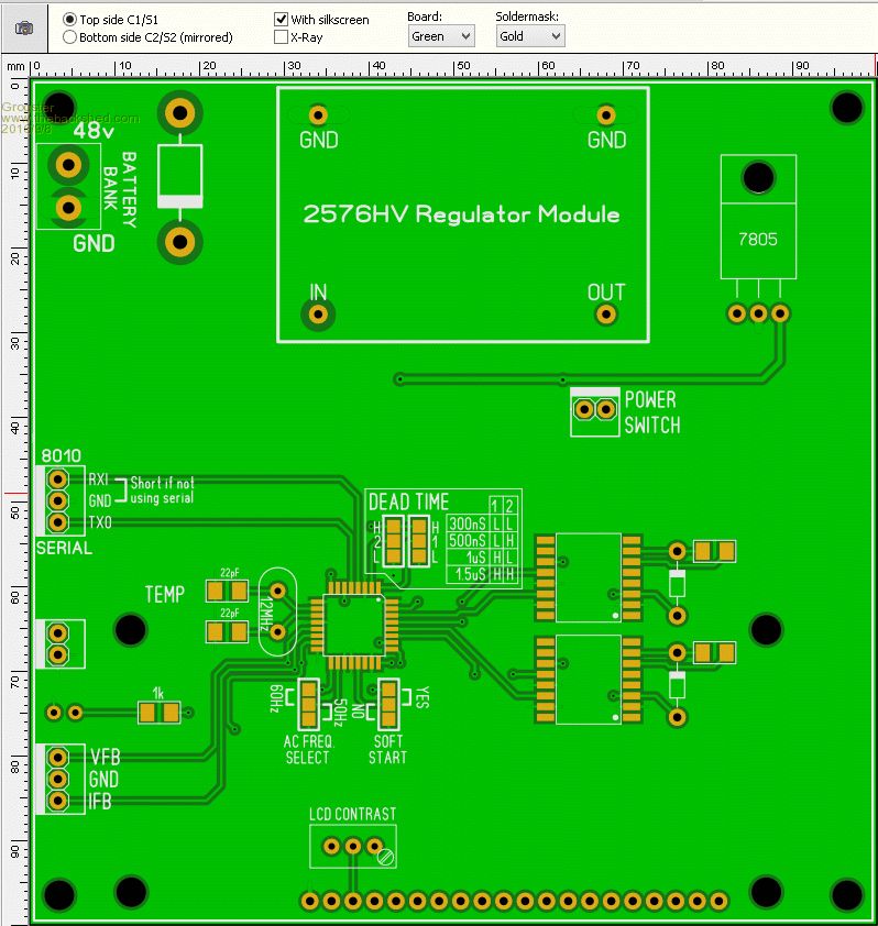 This controller board design has the ST7920 LCD module mounted on the front-facing side, so the board will display the vitals of the inverter without needing additional external voltage and current sense boards or modules: