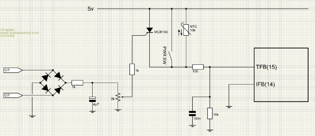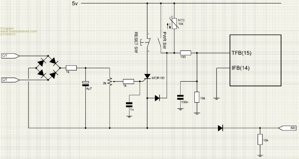 At the same time that happens, the TFB pin on the 8010 is pulled high via another gating diode, which stops it flat in it's tracks with what it thinks is an over-temp issue. The diode idea is Oz's, and I think I have that right in what he was thinking?