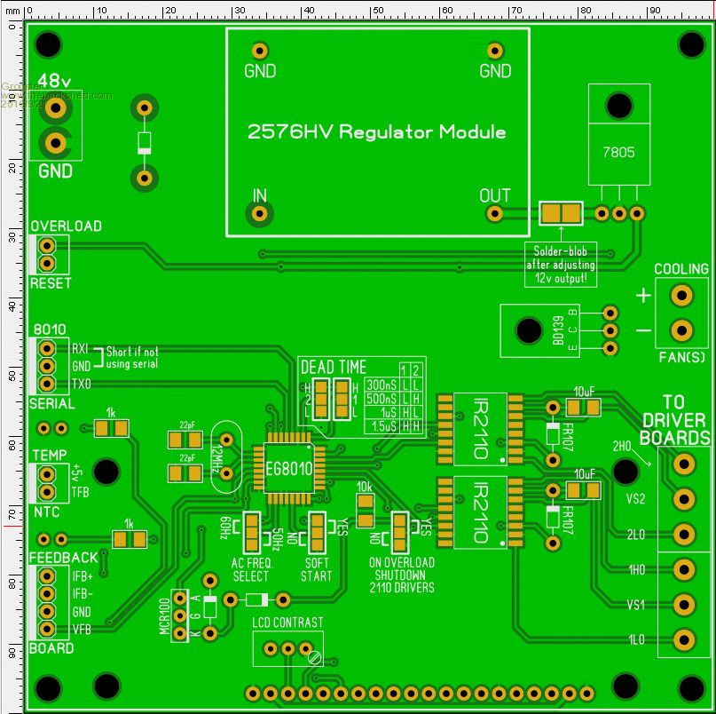 Yes there are many things to take into account when designing high power electronics, and I suspect not too many ee's even have played with this kind of power. We need to keep signal separate from current lines where possible, keep high current runs as short as practical, keep the caps as close as possible to the fets etc etc etc.... and you will end up with the PJ style soon enough. The circulating currents here can get up in the multi hundred amps on surges, and it is here you need it not to fail. It is no good to have it humming along nicely at a few hundred watts, and then stumble when you switch heavy loads or use triac triggered kilowatt heat guns ( or hair driers)... thats when your design needs to be sound, and not introduce more noise into the trigger circuits than necessary. That said, this design seems pretty stable and I have done a lot of sinning that any EE would have apoplexy just looking at it I suspect... so they are very stable and can put up with a good deal of poor design, and still give excellent performance.... but for the power section........ don't stray too far from the "norms". I am not an EE, so don't know what I'm doing, so I keep to similar things I see them do in normal circumstances..... in simple terms... copy clockman/pj design, and it will work fine. Lots of other designs will work just as well or better, but I am not privvy to most of them. As your getting the boards made, just get them doublw thickness, and use lots of copper where it counts.... much simpler to deal with. ........oztules Village idiot...or... just another hack out of his depth |
